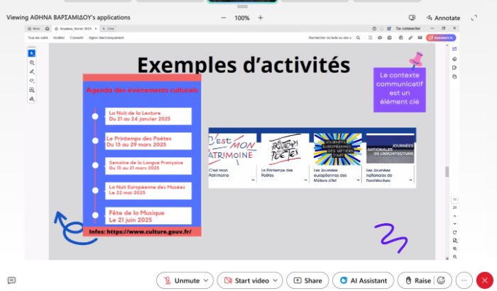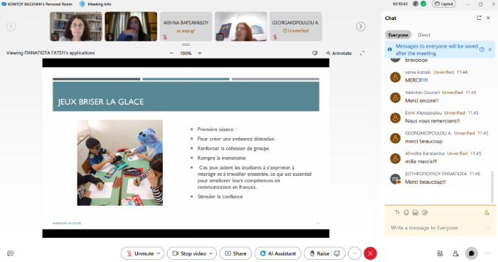 Η τρίωρη επιμορφωτική συνάντηση πραγματοποιήθηκε διαδικτυακά το Σάββατο 15 Φεβρουαρίου 2025 και διοργανώθηκε από την Συντονίστρια Πρωτοβάθμιας και Δευτεροβάθμιας Εκπαίδευσης τού Γαλλικού Τμήματος, κ. Βασιλική Κοντού, στο πλαίσιο των συνεχών επιμορφωτικών δράσεων των εκπαιδευτικών μας.