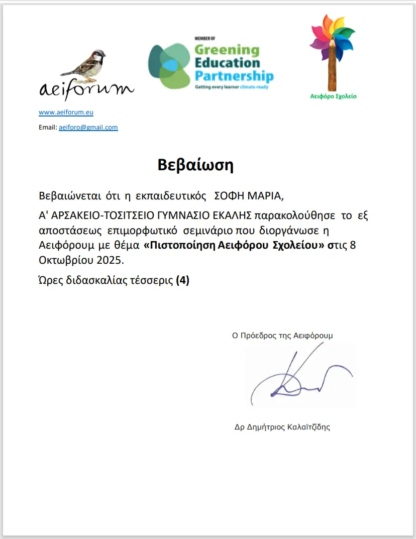 Στο πλαίσιο της συνεχούς προσπάθειας για την προώθηση της περιβαλλοντικής εκπαίδευσης και της βιώσιμης ανάπτυξης, το Α΄ Αρσάκειο- Τοσίτσειο Γυμνάσιο Εκάλης συμμετείχε στην επιμορφωτική διαδικτυακή συνάντηση που πραγματοποιήθηκε την Τετάρτη 8 Οκτωβρίου 2025, με θέμα την Πιστοποίηση Αειφόρου Σχολείου.