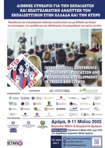 Η καθηγήτρια Γαλλικής Γλώσσας του Β΄Αρσακείου-Τοσιτσείου Δημοτικού Εκάλης κ. Ευφροσύνη Γεώργα συμμετείχε στις εργασίες του Διεθνούς Συνεδρίου για την εκπαίδευση και την επαγγελματική ανάπτυξη των εκπαιδευτικών στην Ελλάδα και την Κύπρο (INTERNATIONAL CONFERENCE ON TEACHERS’ EDUCATION AND PROFESSIONAL DEVELOPMENT IN GREECE AND CYPRUS), με τίτλο «Εκπαίδευση και επαγγελματική ανάπτυξη εκπαιδευτικών για μια Ελλάδα και Κύπρο της καινοτομίας, της προόδου και της αλληλεγγύης : η μεταρρύθμιση που πρέπει να γίνει» που πραγματοποιήθηκε στη Δράμα στις 9,10 και 11 Μαΐου 2025 (δείτε εδώ).
