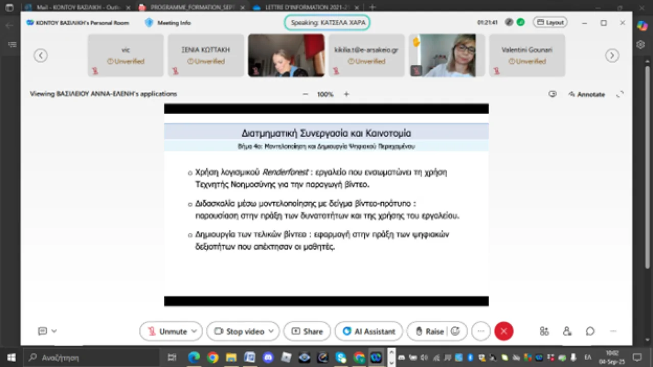 Η φετινή τετράωρη επιμόρφωση πραγματοποιήθηκε την Πέμπτη 4 Σεπτεμβρίου 2025 και είχε ως θέμα τη σύντομη παρουσίαση καινοτόμων προσεγγίσεων στη διδασκαλία μέσω τής Τεχνητής Νοημοσύνης, την ενημέρωση για έργα eTwinning των Σχολείων μας, τη συμμετοχή μαθητών μας στο πρόγραμμα “Artemis mission”, την παρουσίαση εκπαιδευτικών ιστοτόπων και ευρωπαϊκών προγραμμάτων, καθώς και τη διάχυση καλών πρακτικών μεταξύ συναδέλφων.