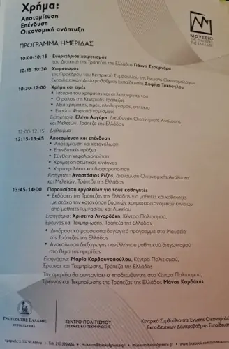 Την ημερίδα άνοιξε ο Διοικητής τής Τράπεζας τής Ελλάδος κ. Γιάννης Στουρνάρας, τονίζοντας τη σημασία τού χρηματοοικονομικού εγγραμματισμού για τους νέους. Στη συνέχεια, στελέχη τής Τράπεζας Ελλάδος παρουσίασαν, με πολύ εποικοδομητικό τρόπο, το χρήμα και τις τιμές, την αποταμίευση και την επένδυση, καθώς και εργαλεία για τους καθηγητές. Ακολούθησε ξενάγηση στο Μουσείο τής Τράπεζας Ελλάδος.