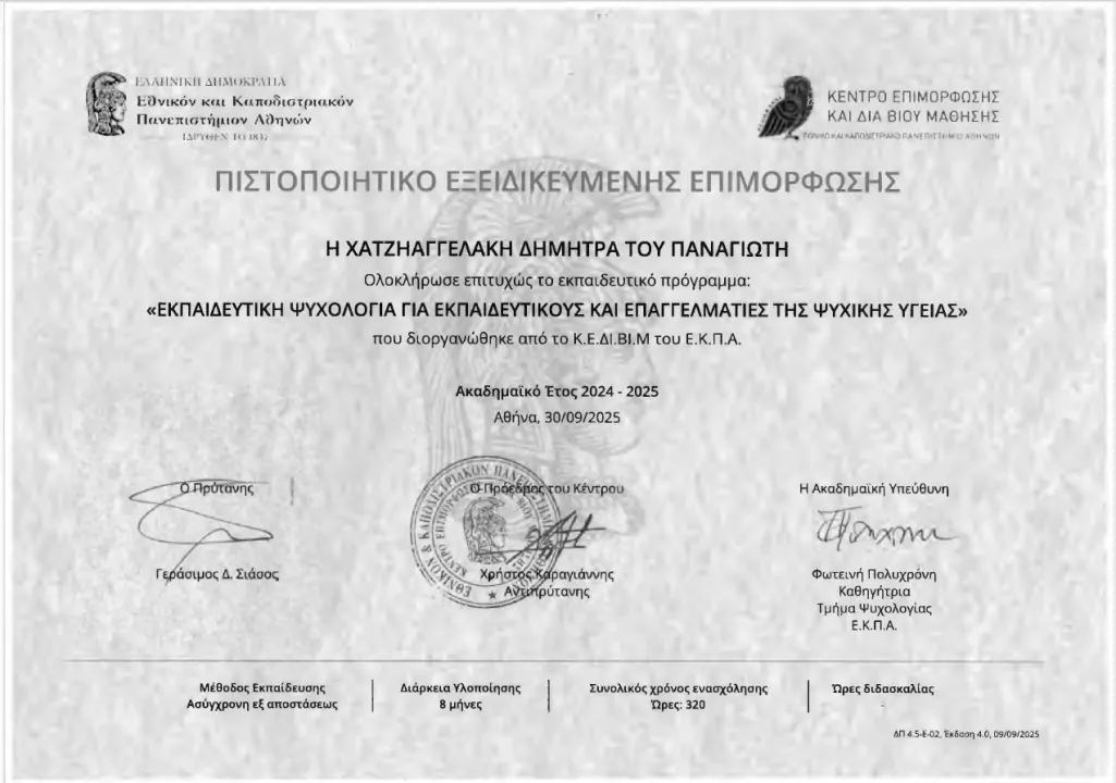 Η δρ Δήμητρα Χατζηαγγελάκη, καθηγήτρια Πολιτικών και Οικονομικών Επιστημών του Β΄Αρσακείου Λυκείου Ψυχικού ολοκλήρωσε έναν τριετή κύκλο σπουδών στην Εκπαιδευτική Ψυχολογία. Στο 1ο έτος: «Κοινωνική και Συναισθηματική Μάθηση στην Εκπαίδευση» (2023) από το Πανεπιστήμιο Πατρών και το 2ο και 3ο έτος, «Εφαρμοσμένη Σχολική Ψυχολογία» (2024 )και «Εκπαιδευτική Ψυχολογία» (2025) από το Κέντρο Επιμόρφωσης και δια Βίου Μάθησης του ΕΚΠΑ.