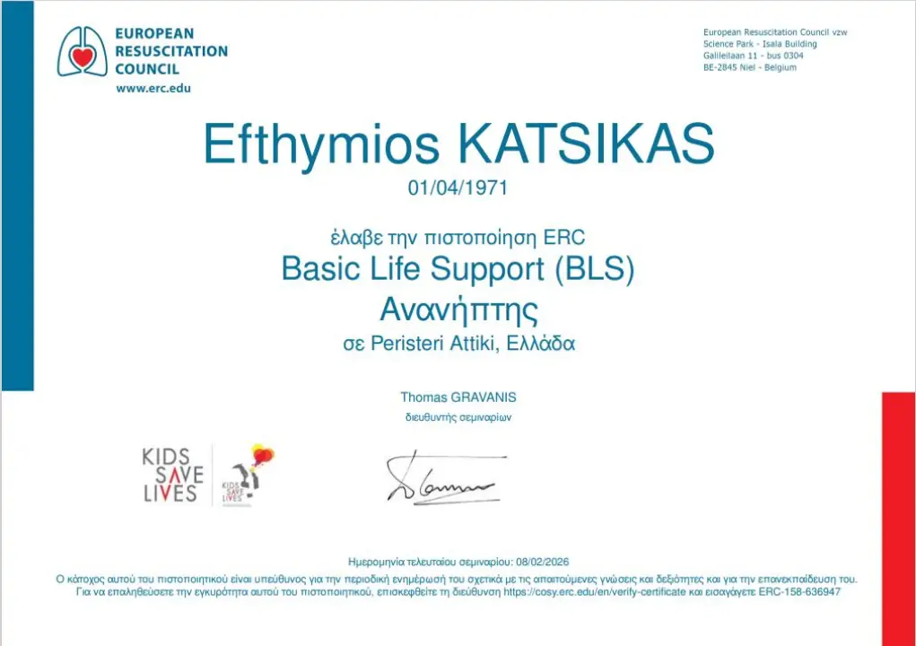 O καθηγητής Φυσικής Αγωγής κ. Ευθύμιος Κάτσικας του Β΄ Αρσακείου Λυκείου Ψυχικού παρακολούθησε στις 8 Φεβρουαρίου, σεμινάριο 6 ωρών που διοργανώθηκε από το European Resucitation Council σε συνεργασία με το Κids SAVE LIVES και πιστοποιήθηκε ως ανανήπτης (Basic Life Support).